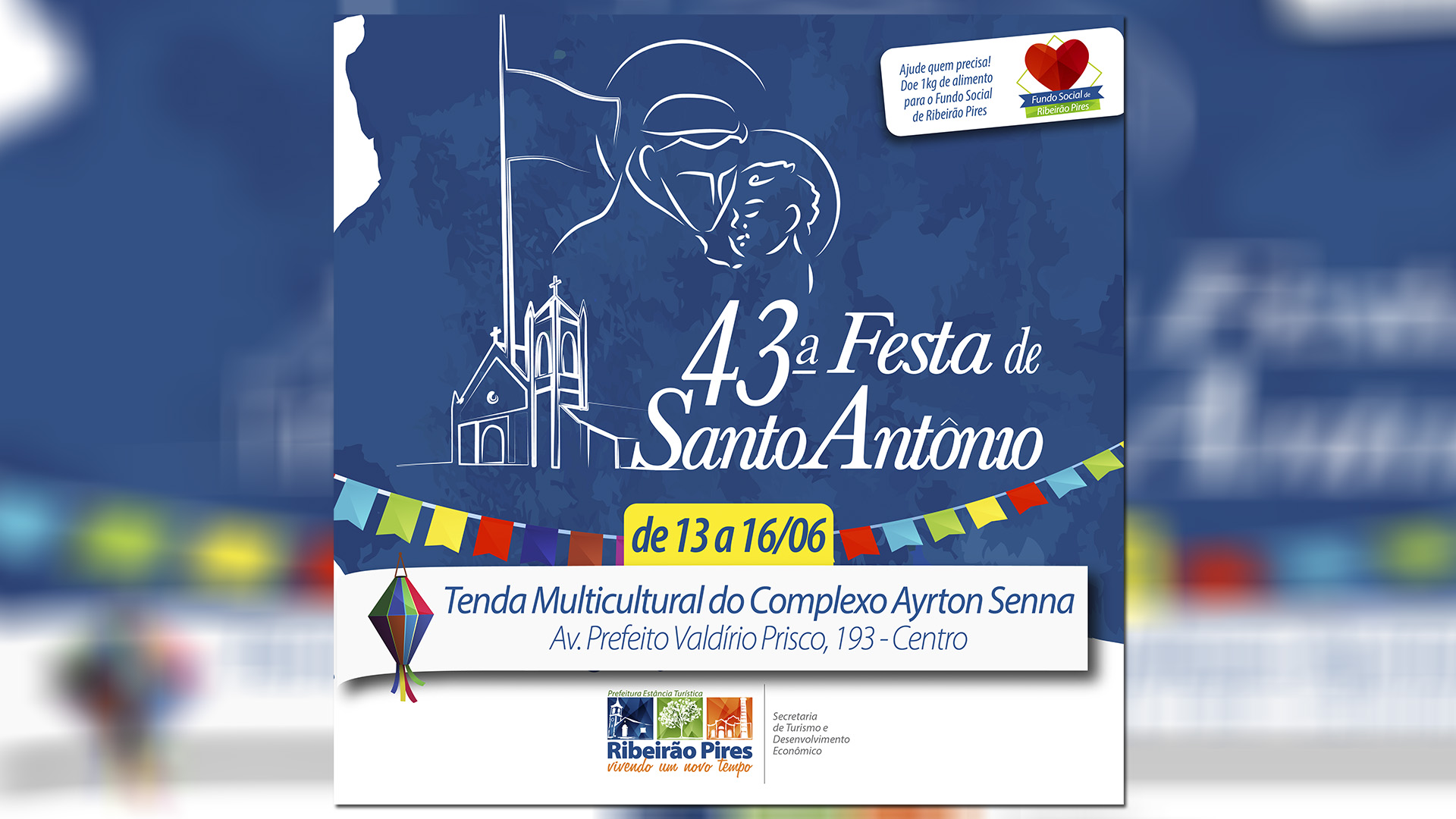 A 43ª edição da Festa de Santo Antônio, realizada pela Prefeitura da Estância Turística de Ribeirão Pires, por meio da Secretaria de Turismo e Desenvolvimento Econômico, reunirá gastronomia típica da época, programação religiosa e cultural. O evento será realizado entre os dias 13 e 16 de junho, na Tenda Multicultural – Complexo Ayrton Senna (Avenida Prefeito Valdírio Prisco, 193).