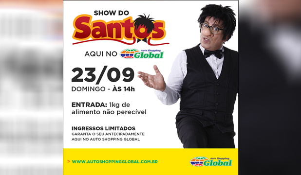 O Show do Santos, humorista conhecido através do Programa do Ratinho no SBT, será realizado no dia 23 de setembro a partir das 14h00, na praça de eventos do Auto Shopping Global.