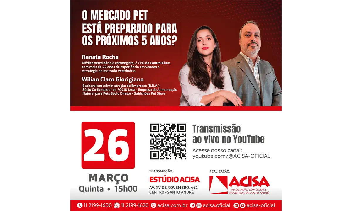 Com a proposta de analisar as tendências e os desafios do mercado pet para os próximos cinco anos, a Associação Comercial e Industrial de Santo André  – ACISA promove, no dia 26 de março (quinta-feira), às 15h, uma live dedicada ao tema. A transmissão será ao vivo pelo canal do YouTube.com/@ACISA-OFICIAL.