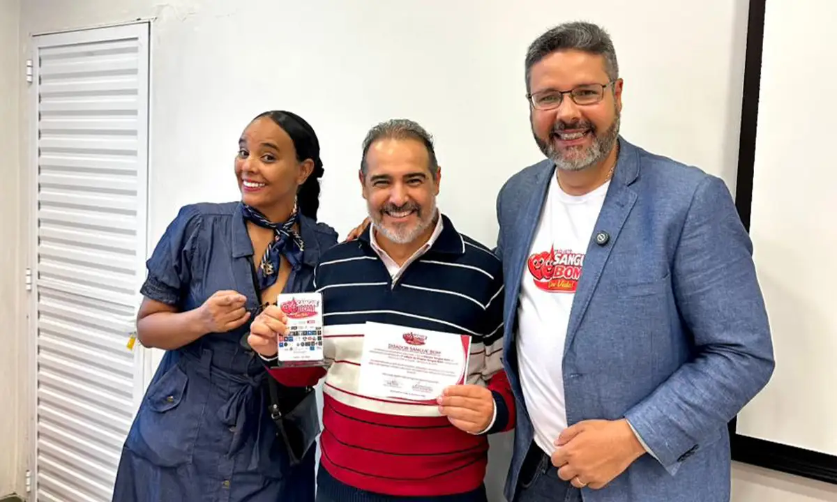 Foto 2: Simone de Souza Silva, embaixadora do projeto Sangue Bom, Valter Moura Júnior e o vereador Jorge Araújo