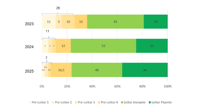 Em três anos de Avaliação de Fluência Leitora, a Educação de São Paulo ampliou o alcance da prova do Alfabetiza Juntos SP: 2023Total de alunos avaliados: 343.838Municípios: 562Percentual de alunos leitores (iniciantes e fluentes): 64,2%Total de alunos leitores (iniciantes e fluentes): 220.863 2024Total de alunos avaliados: 374.282Municípios: 622Percentual de alunos leitores: 76,8%Total de alunos leitores: 287.494 2025Total de alunos avaliados: 432.367Municípios: 645Percentual de alunos leitores: 76,5%Total de alunos leitores: 330.557 Abaixo, o percentual de estudantes em cada um dos níveis na comparação entre os anos: