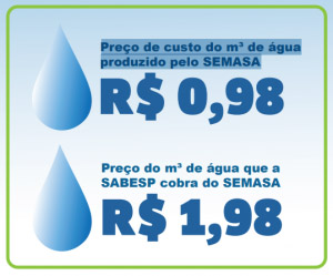 A grande maioria da água consumida em Santo André distribuída pelo SEMASA é comprada da SABESP. Uma pequena parte é produzida diretamente pelo SEMASA, na Estação de Tratamento do Guarará. O problema é que o valor da água cobrado pela SABESP aos municípios é ABUSIVO. Compare no quadro o preço de custo da água produzido pelo SEMASA e o preço da água que a SABESP cobra do SEMASA.