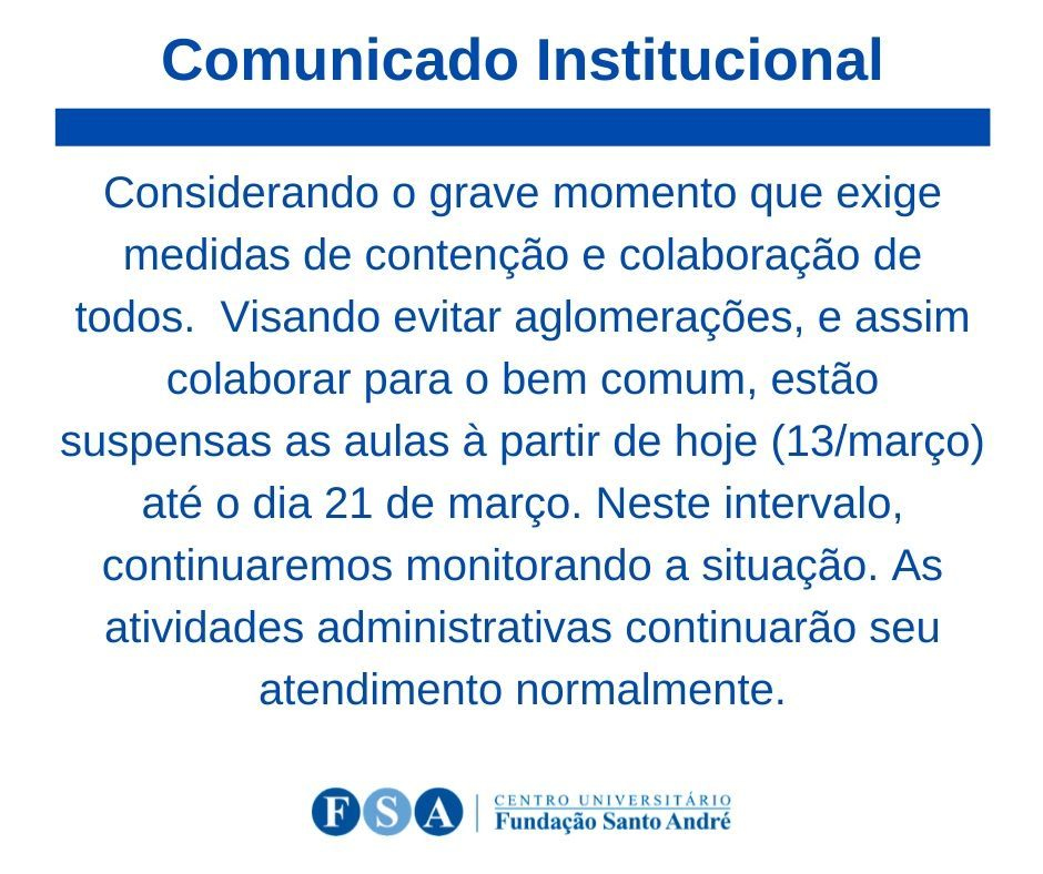 O Centro Universitário Fundação Santo André, postou em suas redes sociais, a suspensão de aulas que tem início já nesta sexta-feira(13) até 21 de março.