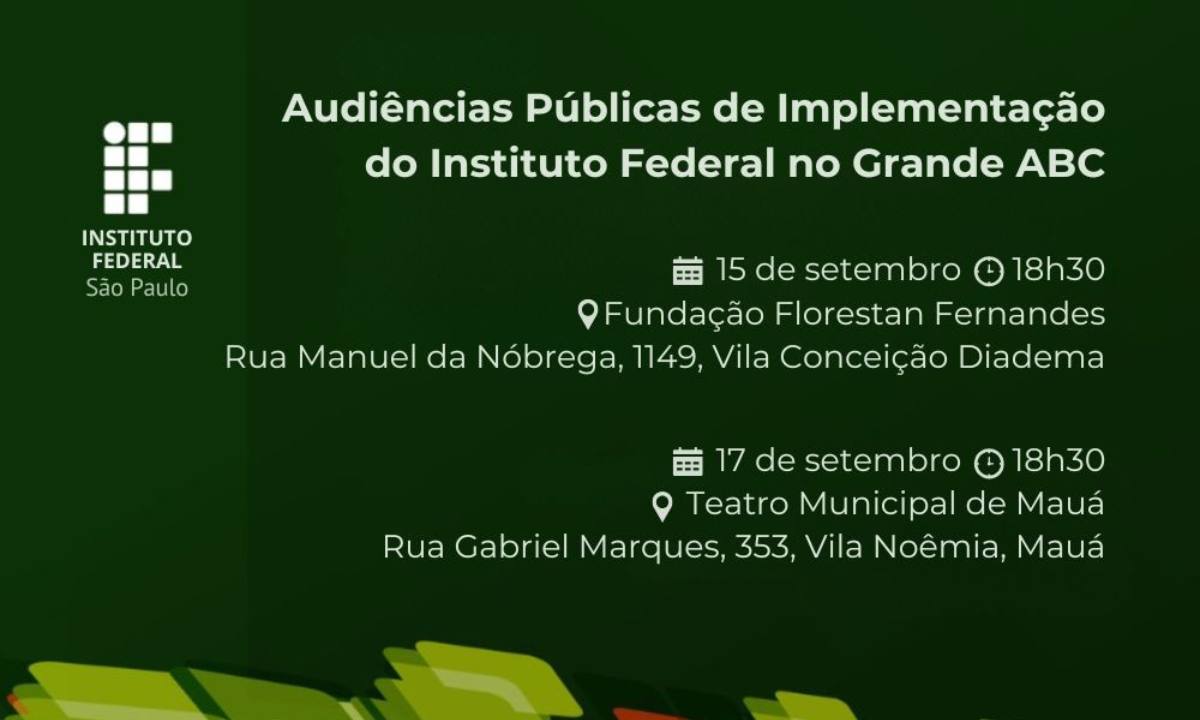 O Grande ABC promove, na próxima semana, a segunda série de audiências públicas para a implementação dos dois primeiros campi do Instituto Federal (IF) na região, que serão instalados em Diadema e Mauá.