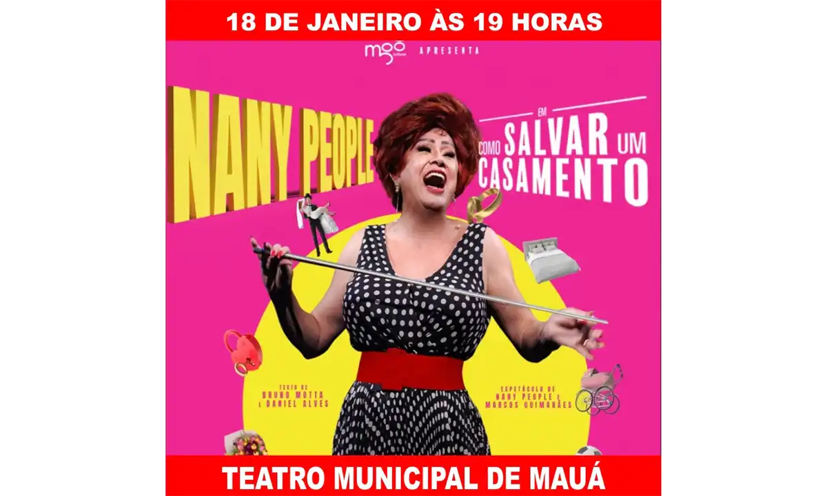 A peça de Nany People não oferece soluções concretas para salvar casamentos, mas sim explora o tema de forma cômica e leve, permitindo que o público se identifique com as situações apresentadas e reflita sobre suas próprias relações. Em resumo, a peça “Como Salvar um Casamento” de Nany People provoca reflexão e identificação, sempre de forma leve e divertida. Indicação: 12 anos. Imperdível! No domingo (18/01), a partir das 19h, no Teatro Municipal de Mauá, à Rua Gabriel Marques, 353, Vila Noemia.