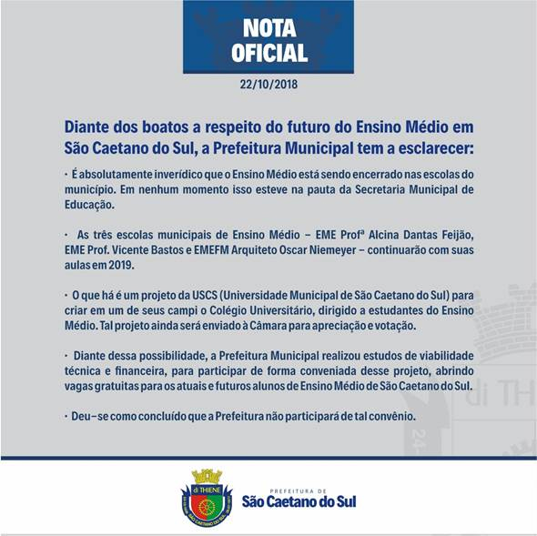Diante dos boatos a respeito do futuro do Ensino Médio em São Caetano do Sul, a Prefeitura Municipal tem a esclarecer: