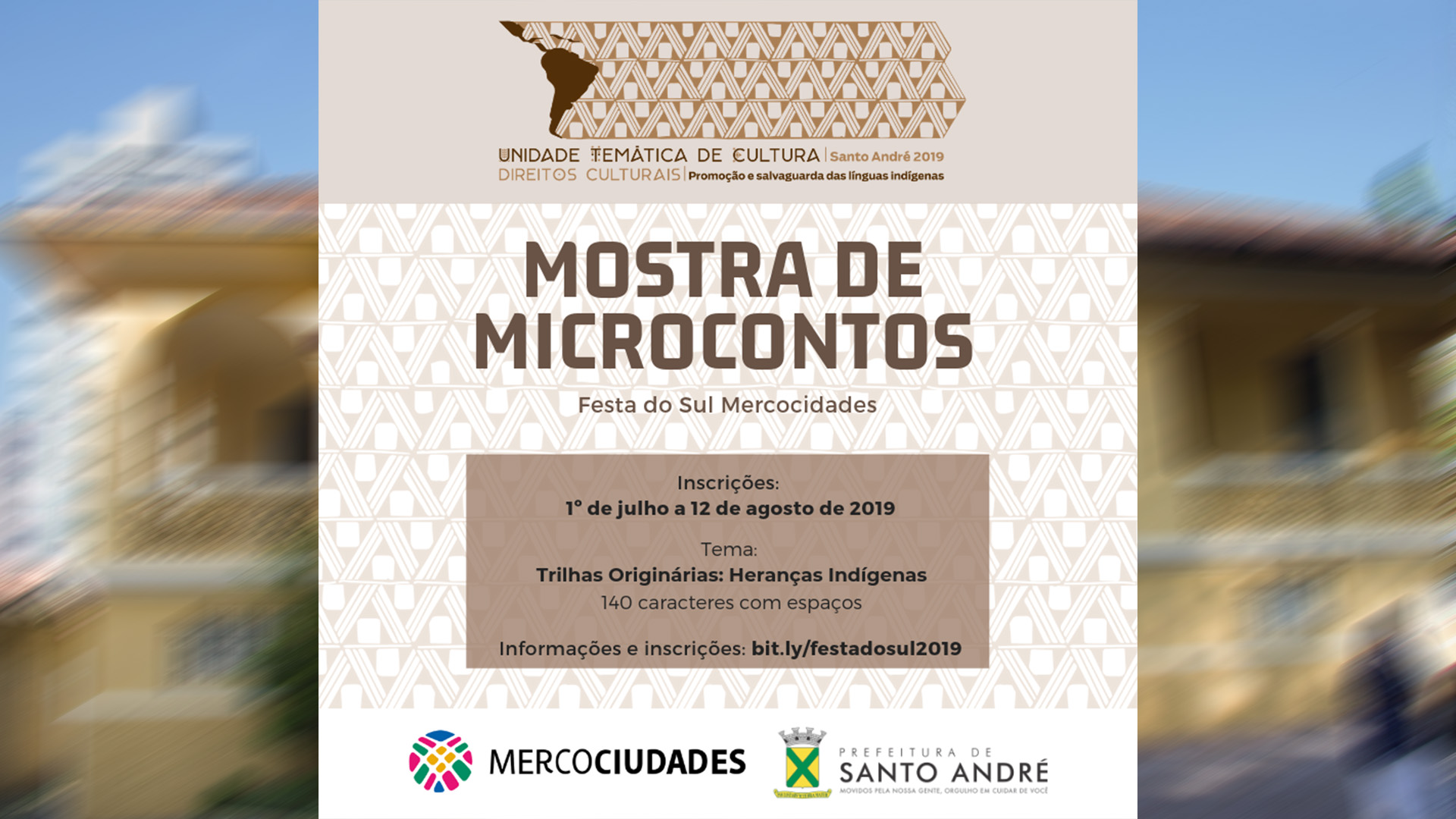 A Secretaria de Cultura de Santo André está com inscrições abertas para a Mostra de Microcontos. O evento tem como tema “Trilhas Originárias: Heranças Indígenas”. Cada participante poderá inscrever três trabalhos inéditos e exclusivos. As inscrições vão até 12 de agosto e devem ser feitas por meio do link https://bit.ly/festadosul2019, onde estão disponíveis regulamento e ficha de inscrição.