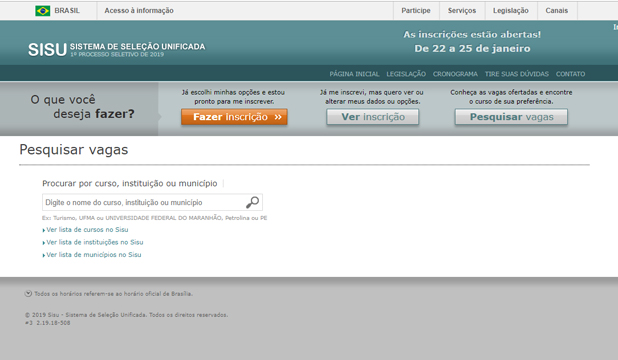 As inscrições começaram hoje (22) e podem ser feitas até sexta-feira (25), na página do Sisu. Ao todo, serão ofertadas 235.461 vagas em 129 instituições públicas de todo o país. Podem concorrer às vagas os estudantes que fizeram o Enem 2018 e obtiveram nota acima de zero na prova de redação.
