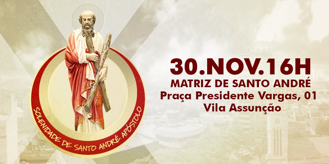 A Solenidade Oficial de Santo André Apóstolo acontece neste sábado (30/11), às 16h, na Igreja Matriz de Santo André localizada na Praça Presidente Vargas, na Vila Assunção, na cidade andreense.
